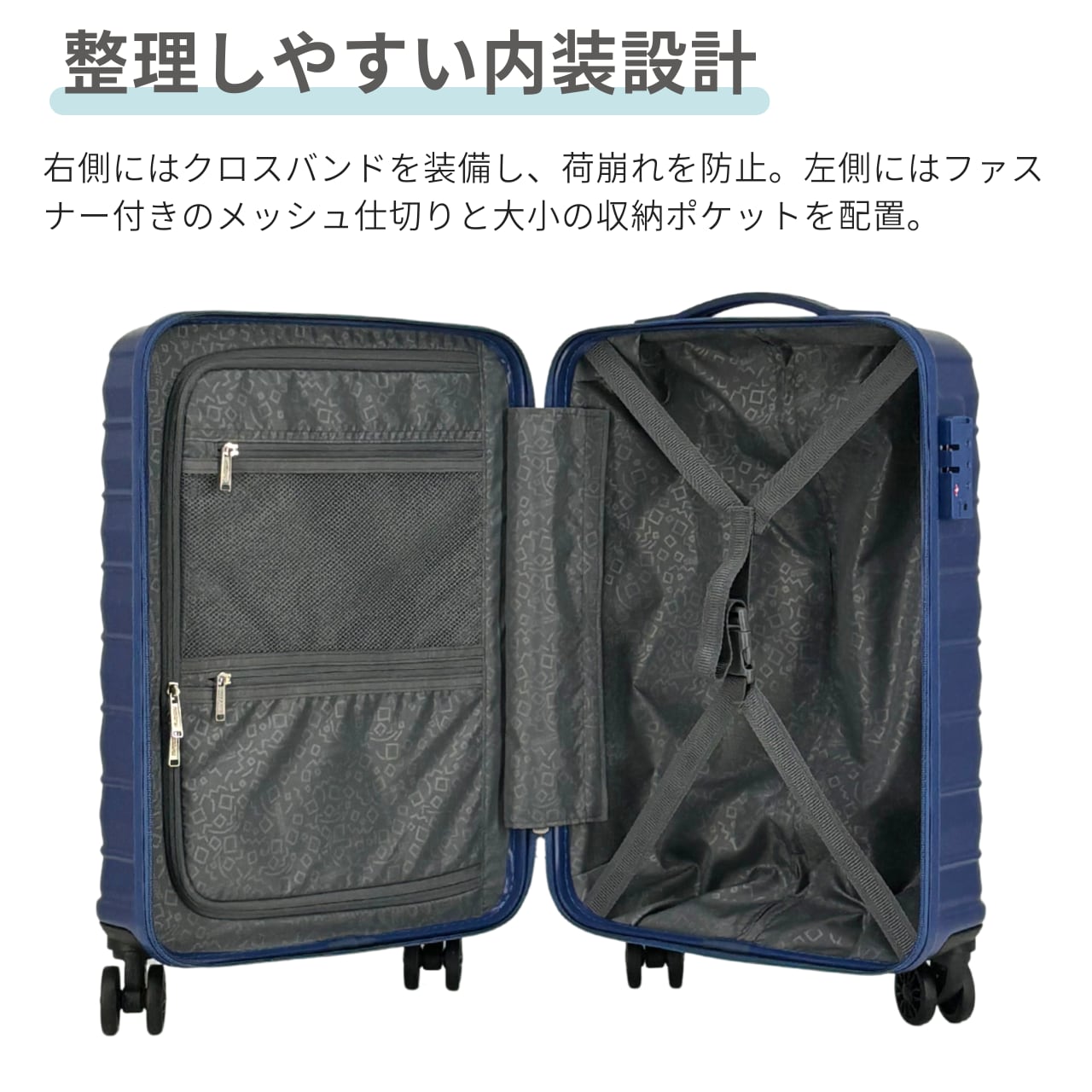 ABS素材の優れた耐久性と洗練されたデザインで、旅行や出張をスマートにサポートします。