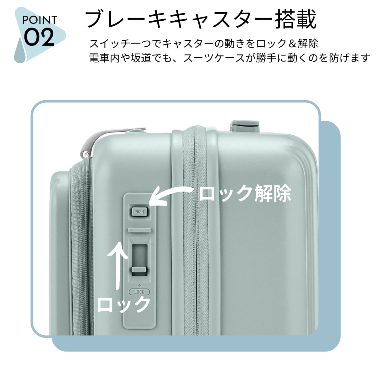 新幹線や電車内、空港の待機時など、スーツケースの不用意な動きを防ぎ、快適で安心な移動をサポートします。