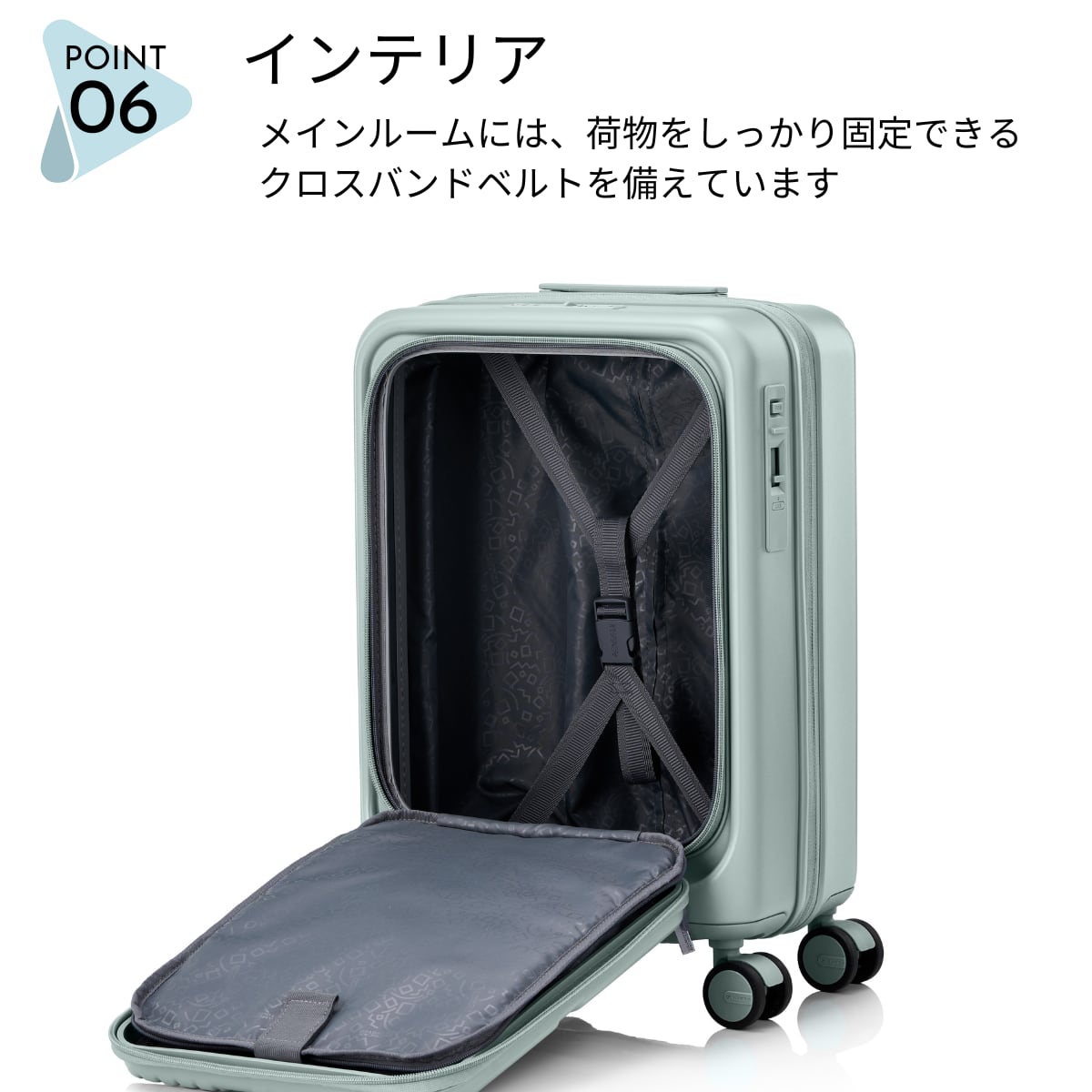 内装には視認性の高い メッシュポケット と、荷崩れを防ぐ クロスストラップ を配置。