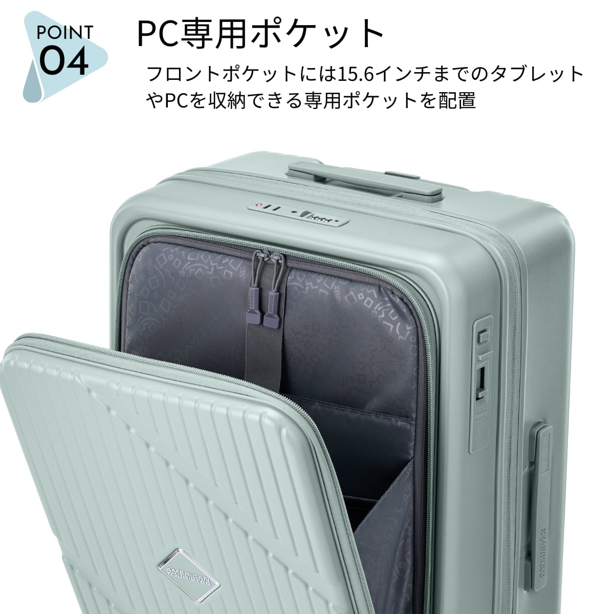 フロントポケットには PC・タブレット専用収納(15.6インチ対応)を装備。
