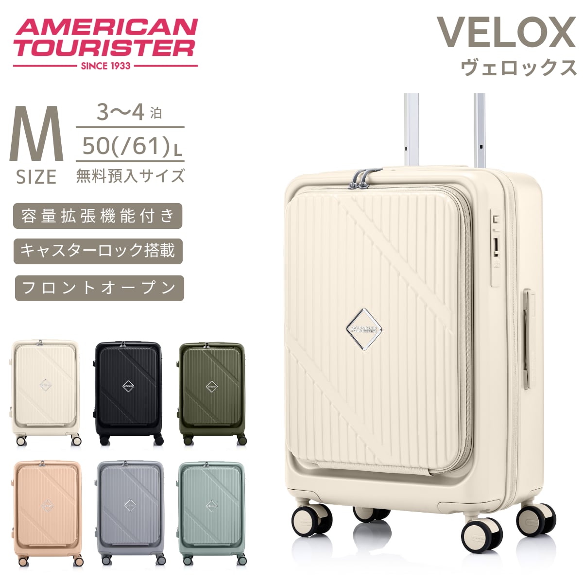 商品名:アメリカンツーリスター ヴェロックス スピナー61 Mサイズ スーツケース 無料預け入れ サムソナイト フロントオープン American Tourister VELOX