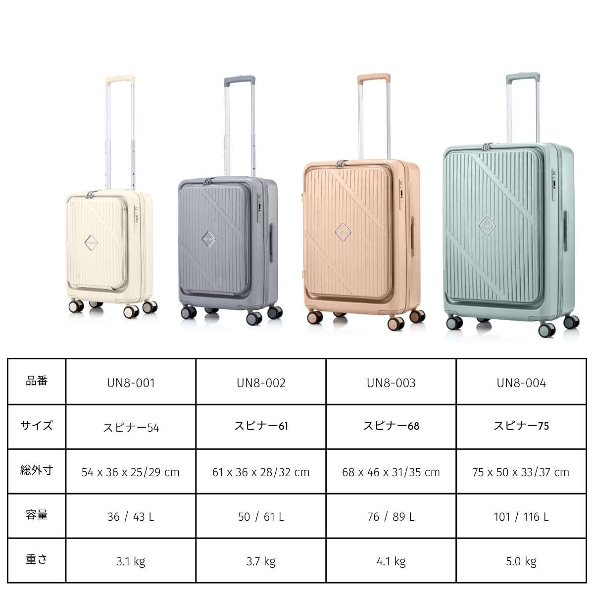 スピナー61は、3~4泊程度の旅行に最適なサイズです。国内旅行や修学旅行、短期の出張におすすめです。フロントポケットにはPC、タブレットなどの収納スペースがありビジネスシーンでも活躍します。
