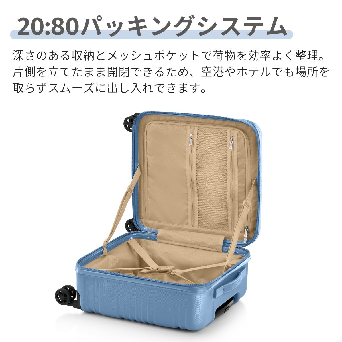 革新的な20:80パッキングシステムにより、大きな荷物から小物類まで効率よく収納でき、旅先での整理整頓もスムーズに行えます。